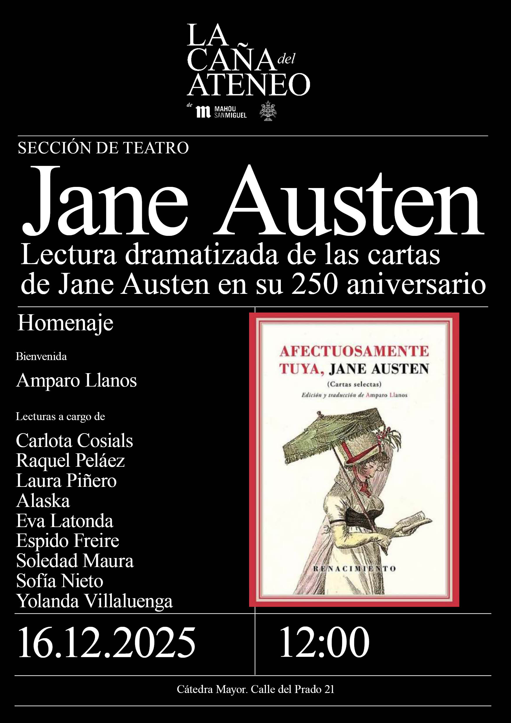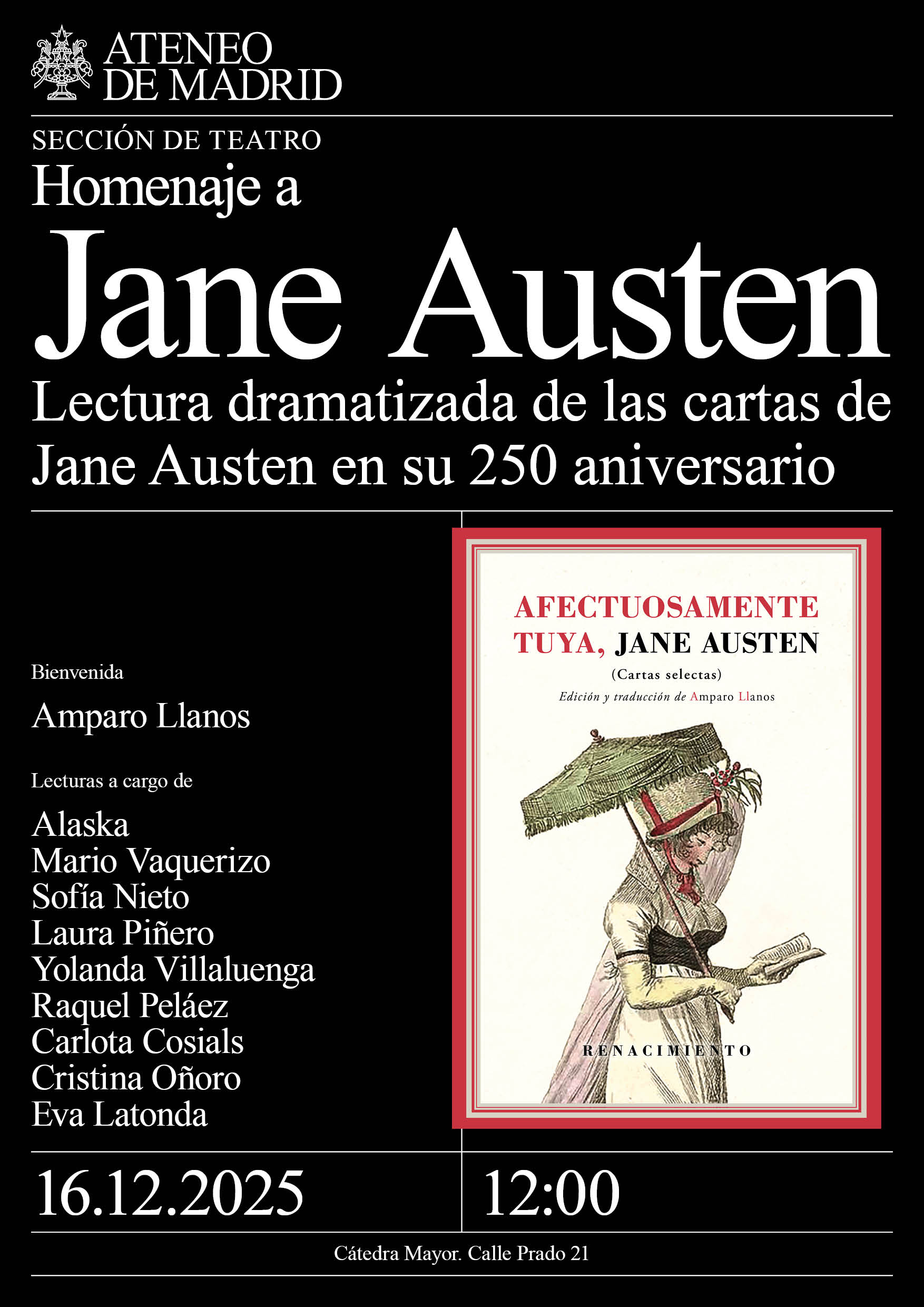 La Sección de Teatro del Ateneo de Madrid organiza un Homenaje a Jane Austen con motivo del 250 aniversario de su nacimiento, a través de una lectura dramatizada de sus cartas basada en el volumen Afectuosamente tuya, Jane Austen (Cartas selectas), edición y traducción de Amparo Llanos. El acto tendrá lugar el martes 16 de diciembre de 2025, a las 12:00 h, en la Cátedra Mayor del Ateneo de Madrid (Calle Prado, 21).