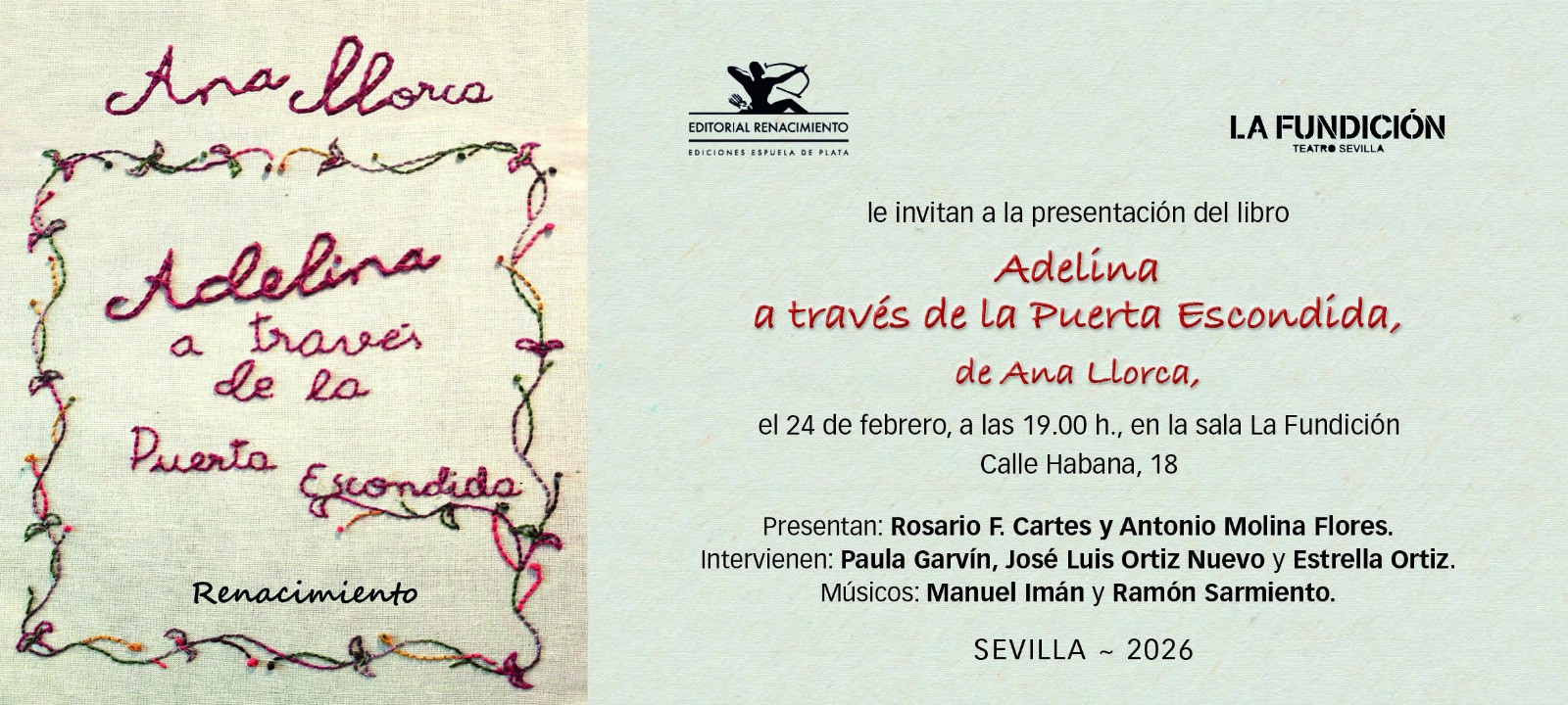 La Editorial Renacimiento y La Fundición Teatro Sevilla os invitan a la presentación del libro Adelina, a través de la Puerta Escondida, de Ana Llorca, que se celebrará el martes 24 de febrero de 2026, a las 19:00 h, en la sala La Fundición (Calle Habana, 18, Sevilla).