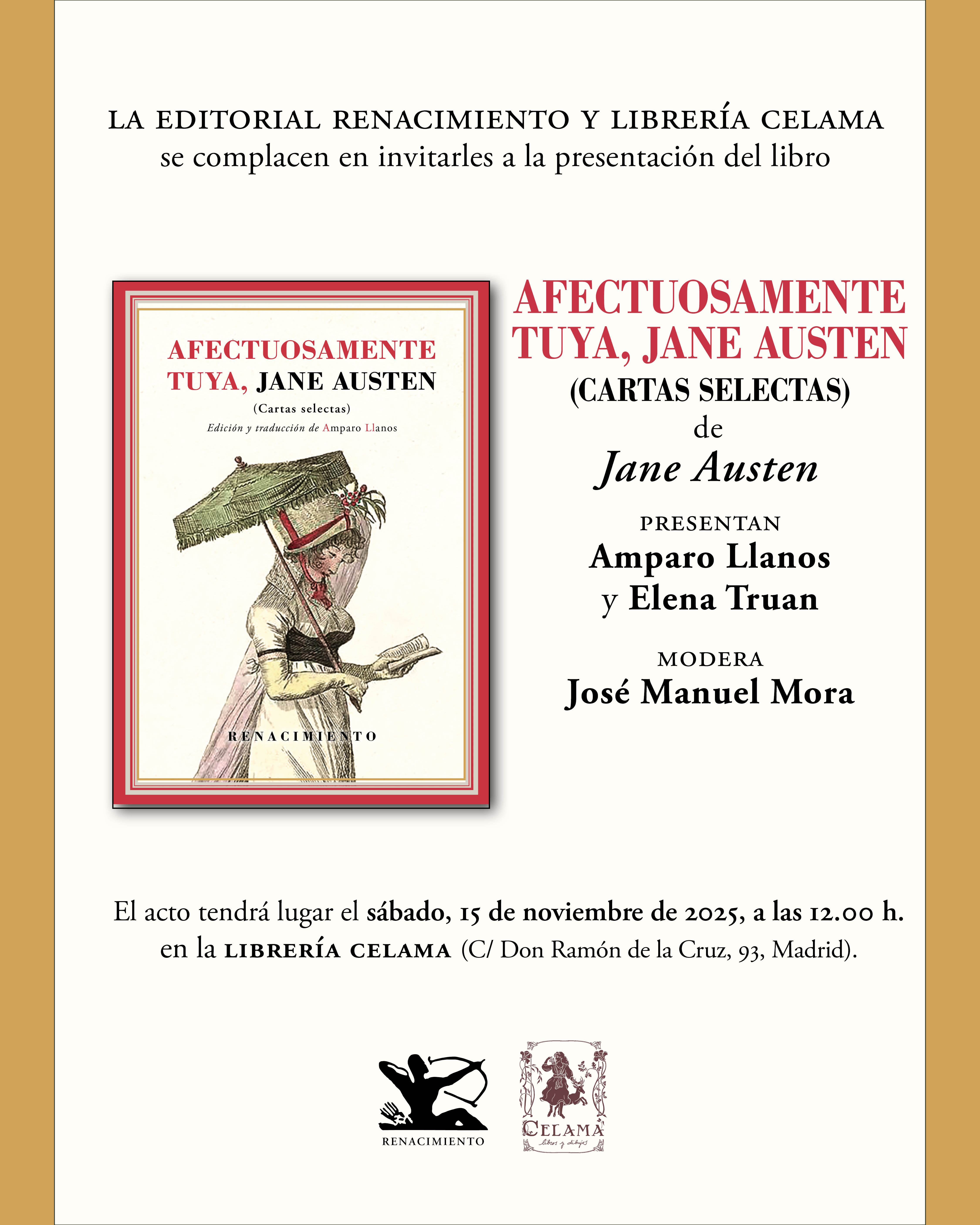 Os invitamos a la presentación del libro Afectuosamente tuya, Jane Austen (Cartas selectas), con edición y traducción de Amparo Llanos, el sábado 15 de noviembre de 2025, a las 12:00 h, en la Librería Celama (C/ Don Ramón de la Cruz, 93, Madrid). Presentarán Amparo Llanos y Elena Truan, con la moderación de José Manuel Mora.