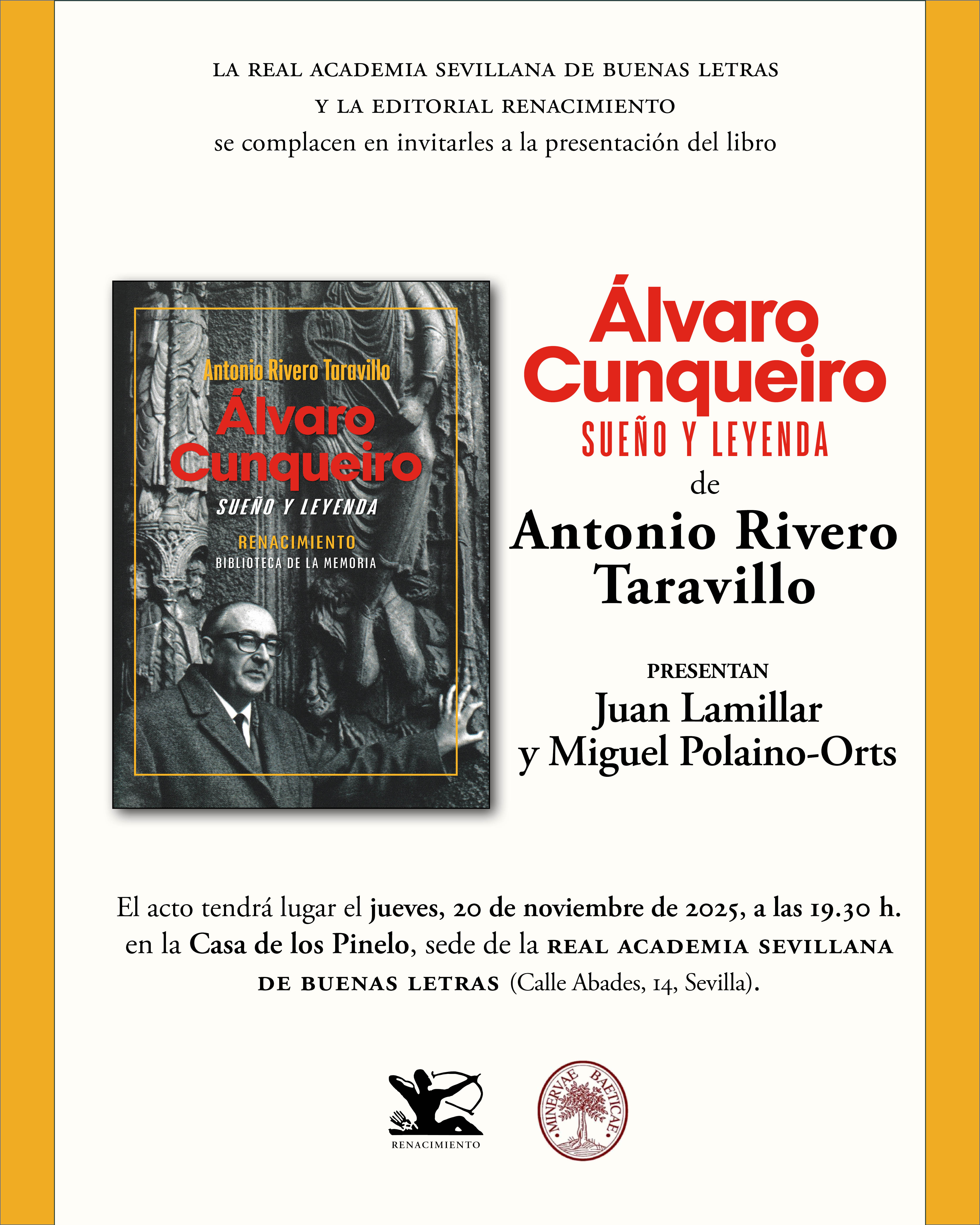 Os invitamos a la presentación del libro Álvaro Cunqueiro, sueño y leyenda de Antonio Rivero Taravillo, el jueves 20 de noviembre de 2025, a las 19:30 h, en la Casa de los Pinelo, sede de la Real Academia Sevillana de Buenas Letras (Calle Abades, 14, Sevilla). Participan Juan Lamillar y Miguel Polaino-Orts.