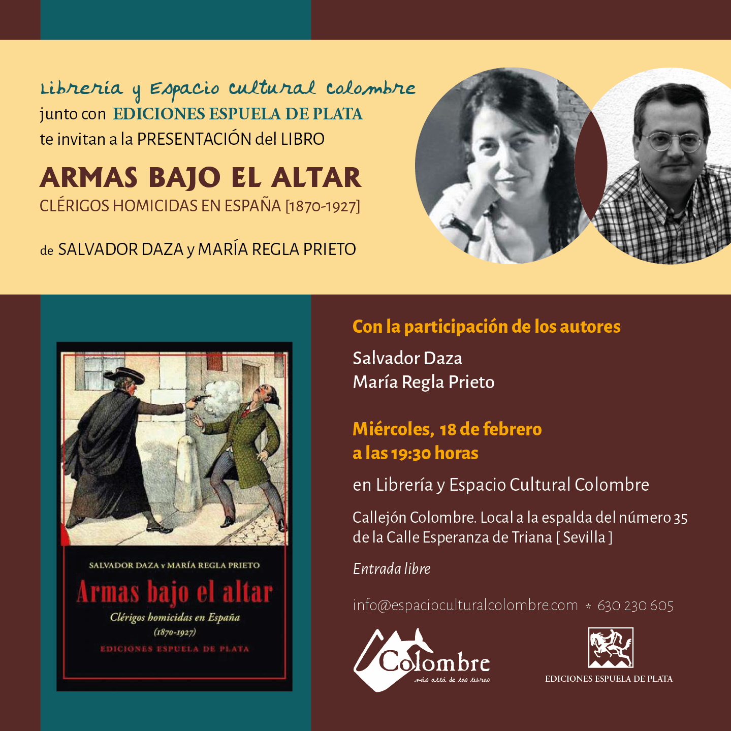 La Librería y Espacio Cultural Colombre, junto con Ediciones Espuela de Plata, os invita a la presentación del libro Armas bajo el altar. Clérigos homicidas en España (1870‑1927), de Salvador Daza Palacios y María Regla Prieto, que tendrá lugar el miércoles 18 de febrero de 2026, a las 19:30 h, en la Librería y Espacio Cultural Colombre (Callejón Colombre, a la espalda del número 35 de la Calle Esperanza de Triana, Sevilla). La entrada será libre hasta completar aforo.