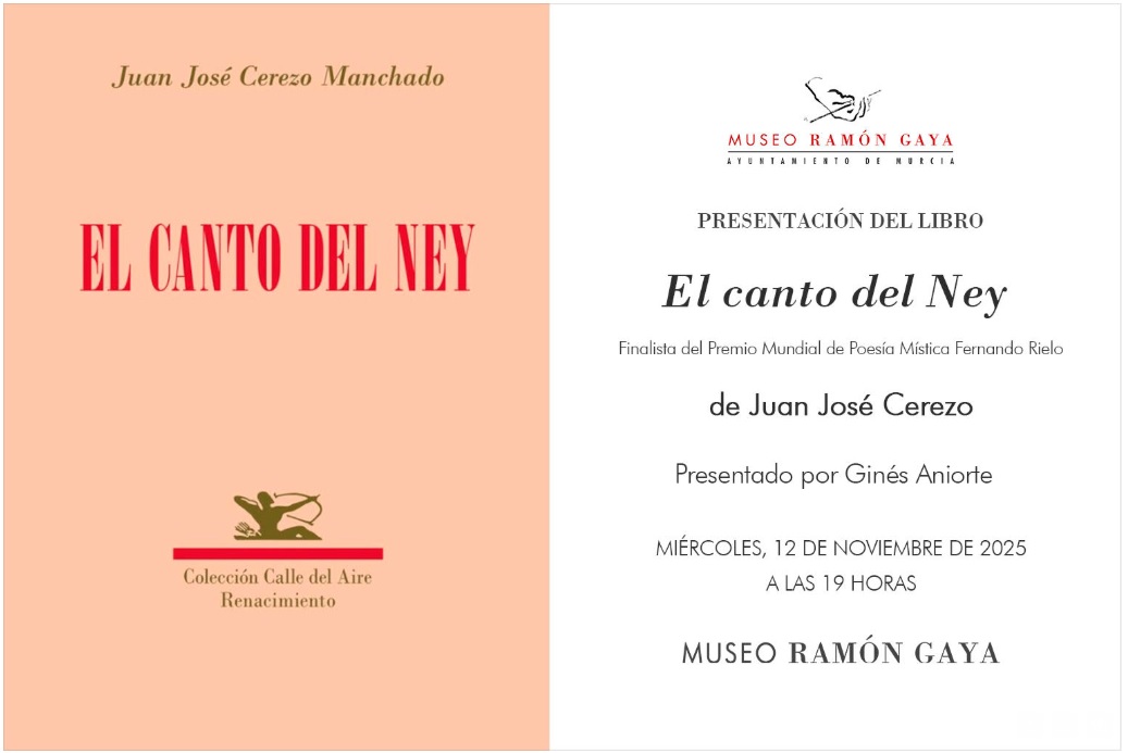 Os invitamos a la presentación del libro El canto del Ney de Juan José Cerezo Manchado, finalista del premio Fernando Rielo, el miércoles 12 de noviembre de 2025, a las 19:00 h, en el Museo Ramón Gaya (Murcia).