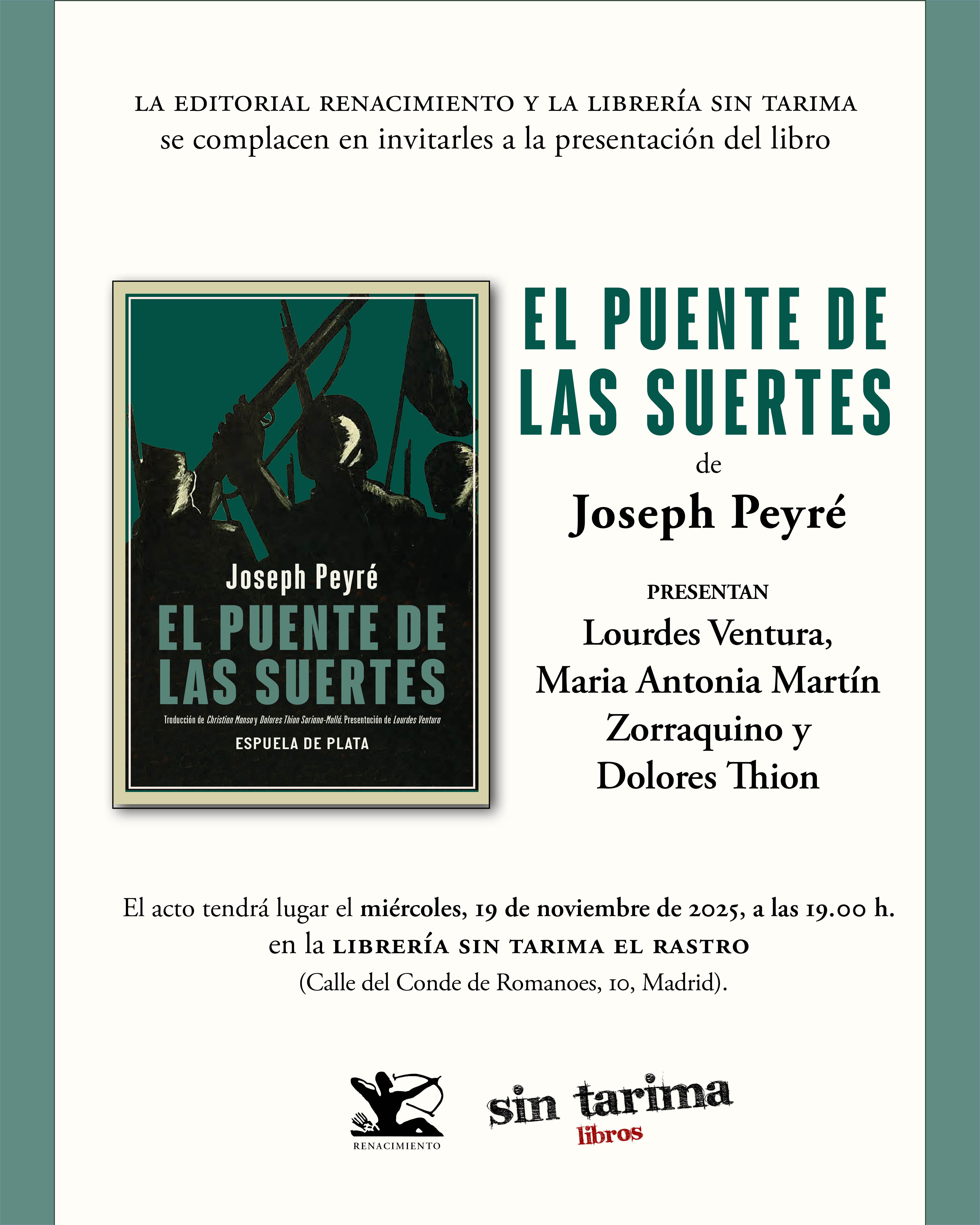 Os invitamos a la presentación del libro El puente de las Suertes de Joseph Peyré, una novela llena de personajes inolvidables en el mundo trémulo de un drama histórico de nuestro país. El acto será el miércoles, 19 de noviembre de 2025, a las 19:00 h, en la Librería Sin Tarima el Rastro (Calle del Conde de Romanones, 10, Madrid). Presentan Lourdes Ventura, Maria Antonia Martín Zorraquino y Dolores Thion.