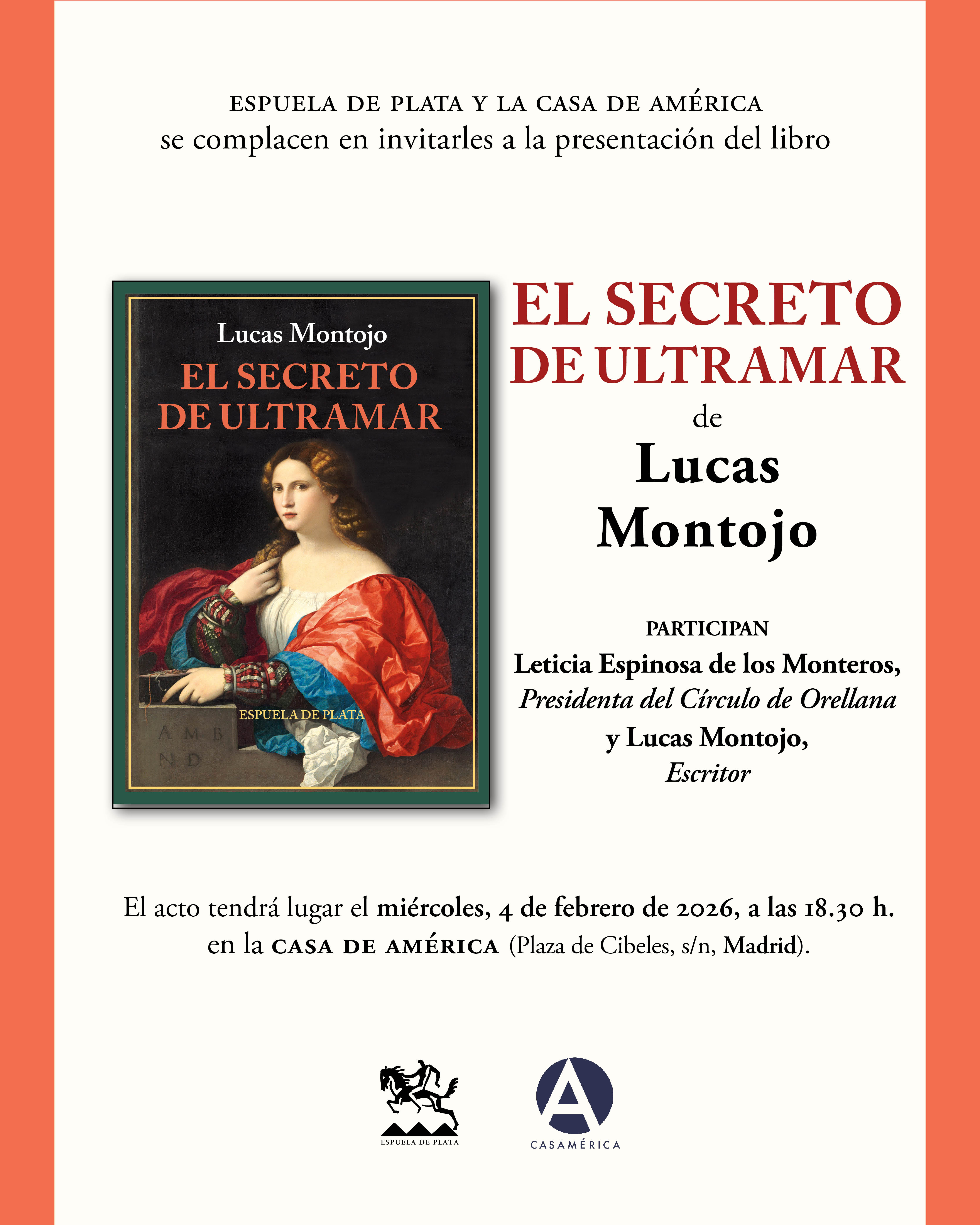 Espuela de Plata y la Casa de América invitan a la presentación del libro El secreto de ultramar, de Lucas Montojo, que tendrá lugar el miércoles, 4 de febrero de 2026, a las 18.30 h, en la Casa de América (Plaza de Cibeles, s/n, Madrid).