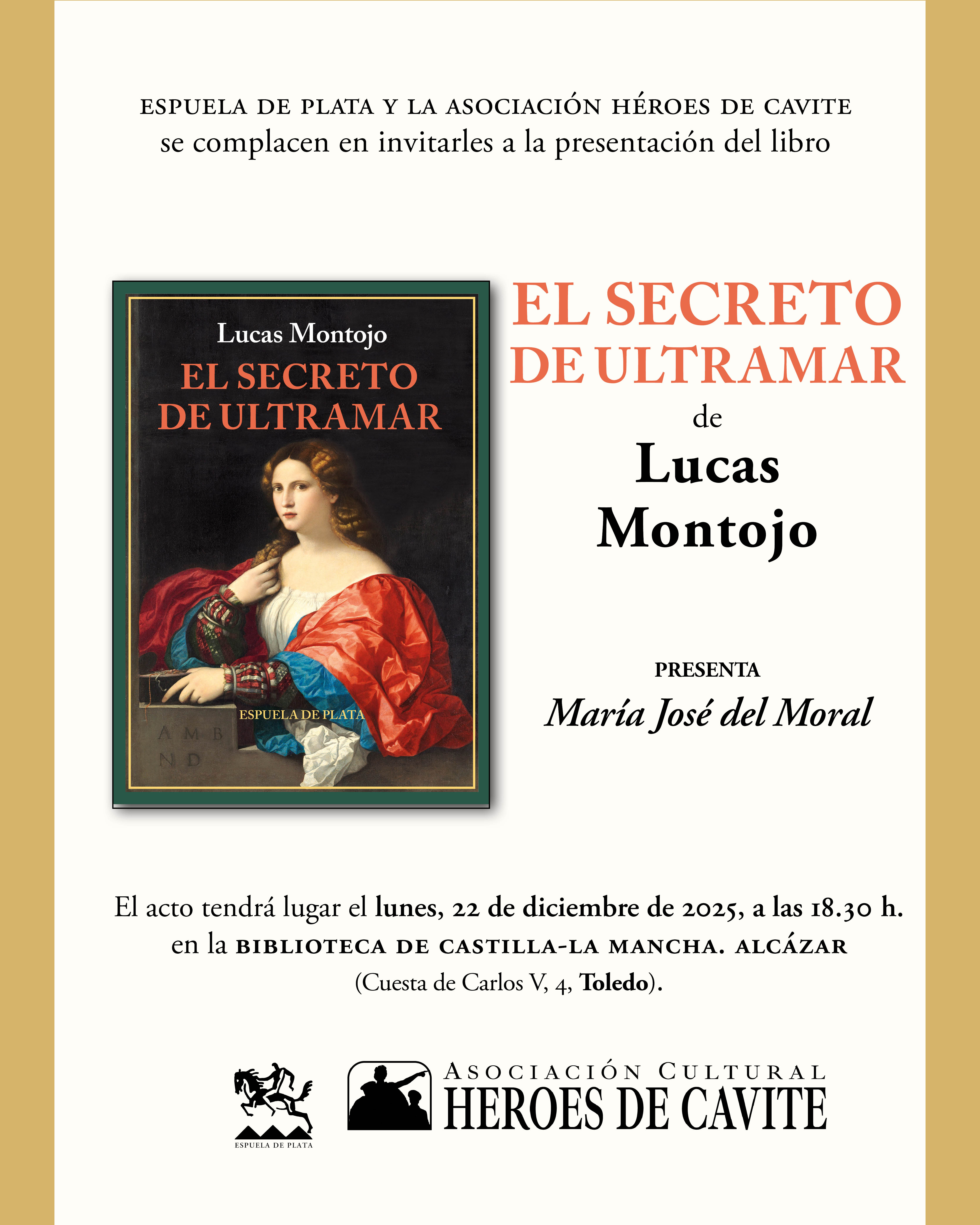 Espuela de Plata y la Asociación Héroes de Cavite os invitan a la presentación de la novela El secreto de ultramar de Lucas Montojo, el lunes 22 de diciembre de 2025, a las 18:30 h, en la Biblioteca de Castilla-La Mancha, en el Alcázar de Toledo (Cuesta de Carlos V, 4). El acto será presentado por María José del Moral.