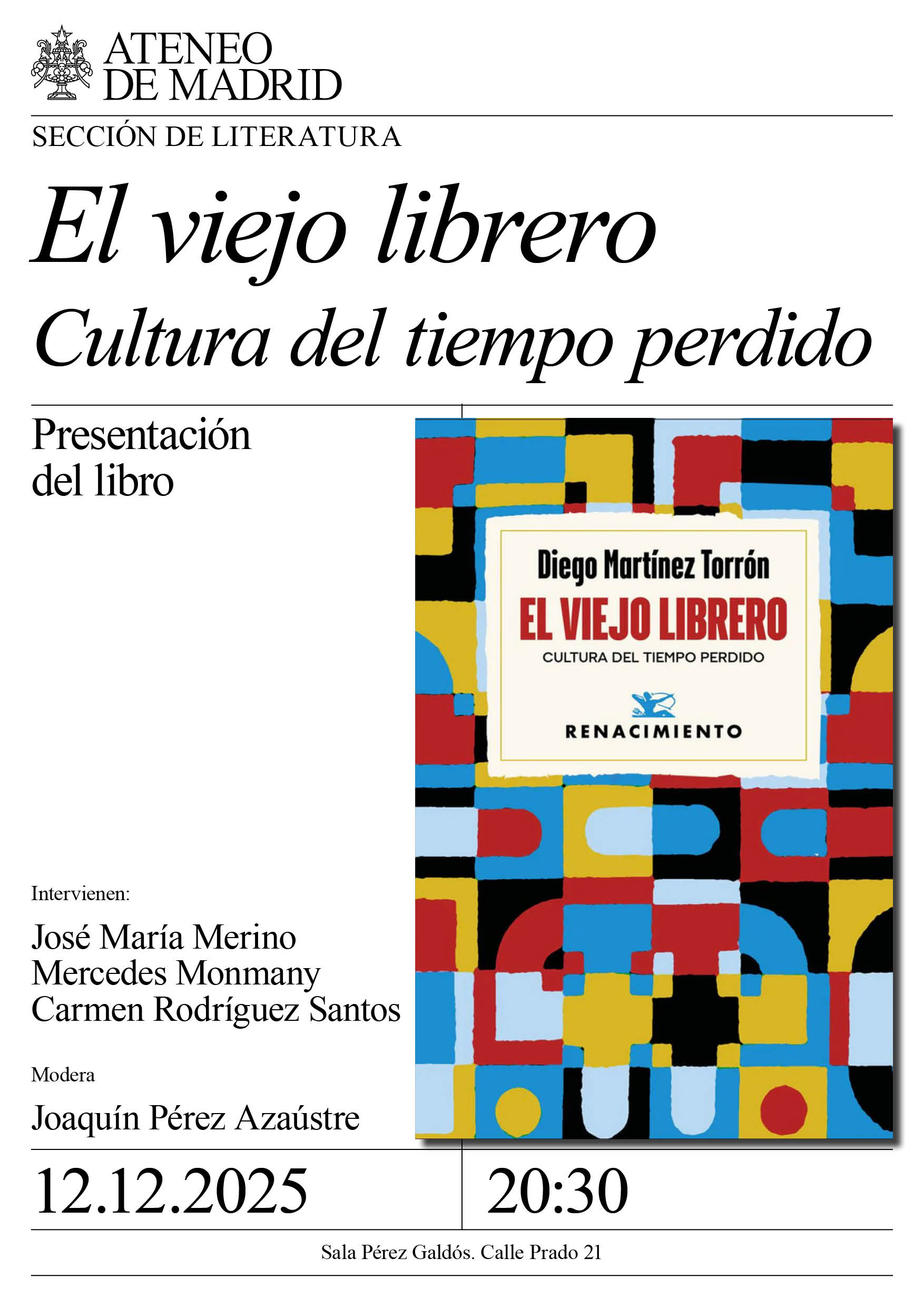 Os invitamos a la presentación del libro El viejo librero. Cultura del tiempo perdido de Diego Martínez Torrón el viernes 12 de diciembre de 2025, a las 20:30 h, en la Sala Pérez Galdós del Ateneo de Madrid (Calle Prado, 21).