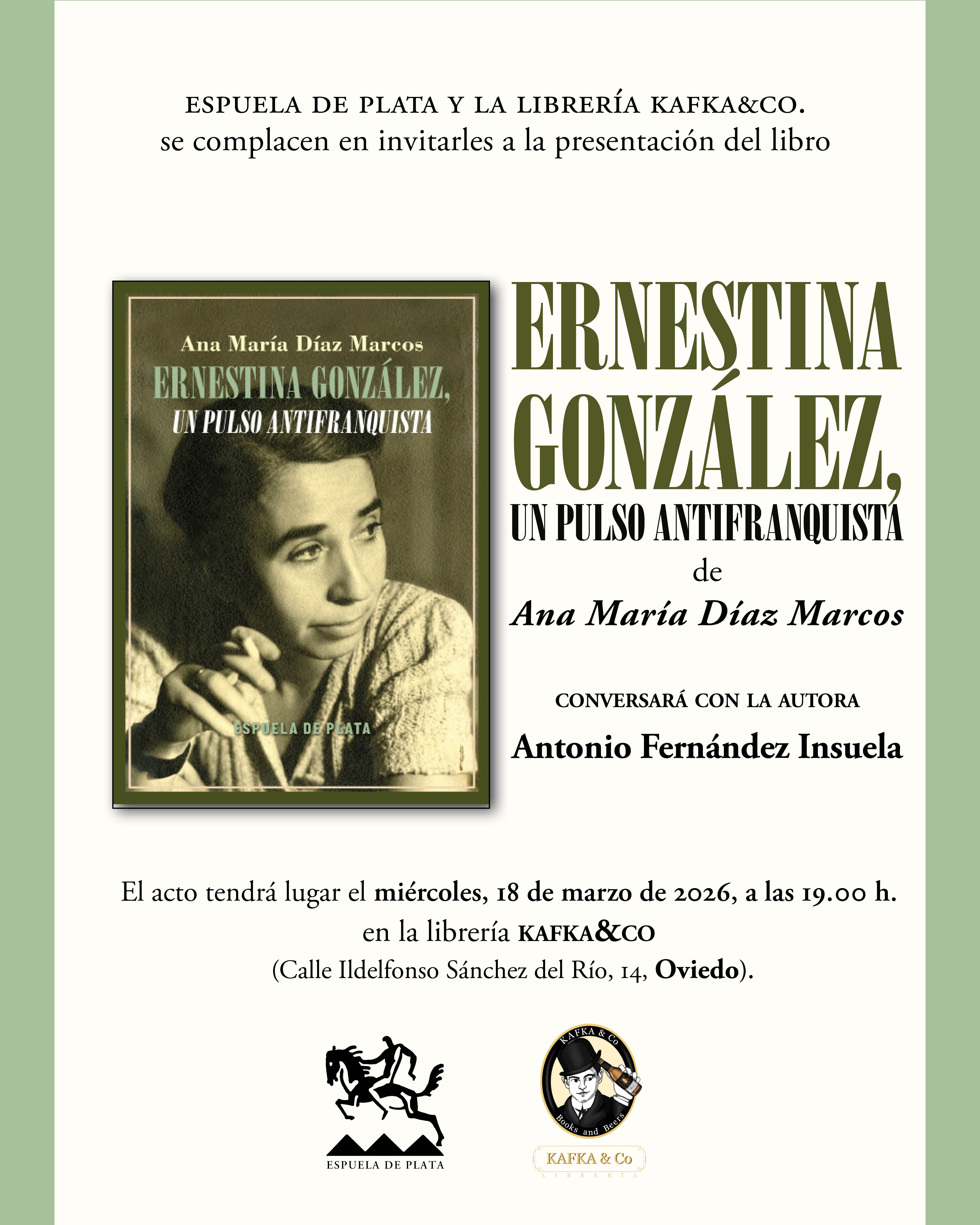Espuela de Plata y la Librería Kafka&Co invitan a la presentación del libro Ernestina González, un pulso antifranquista, de Ana María Díaz Marcos.