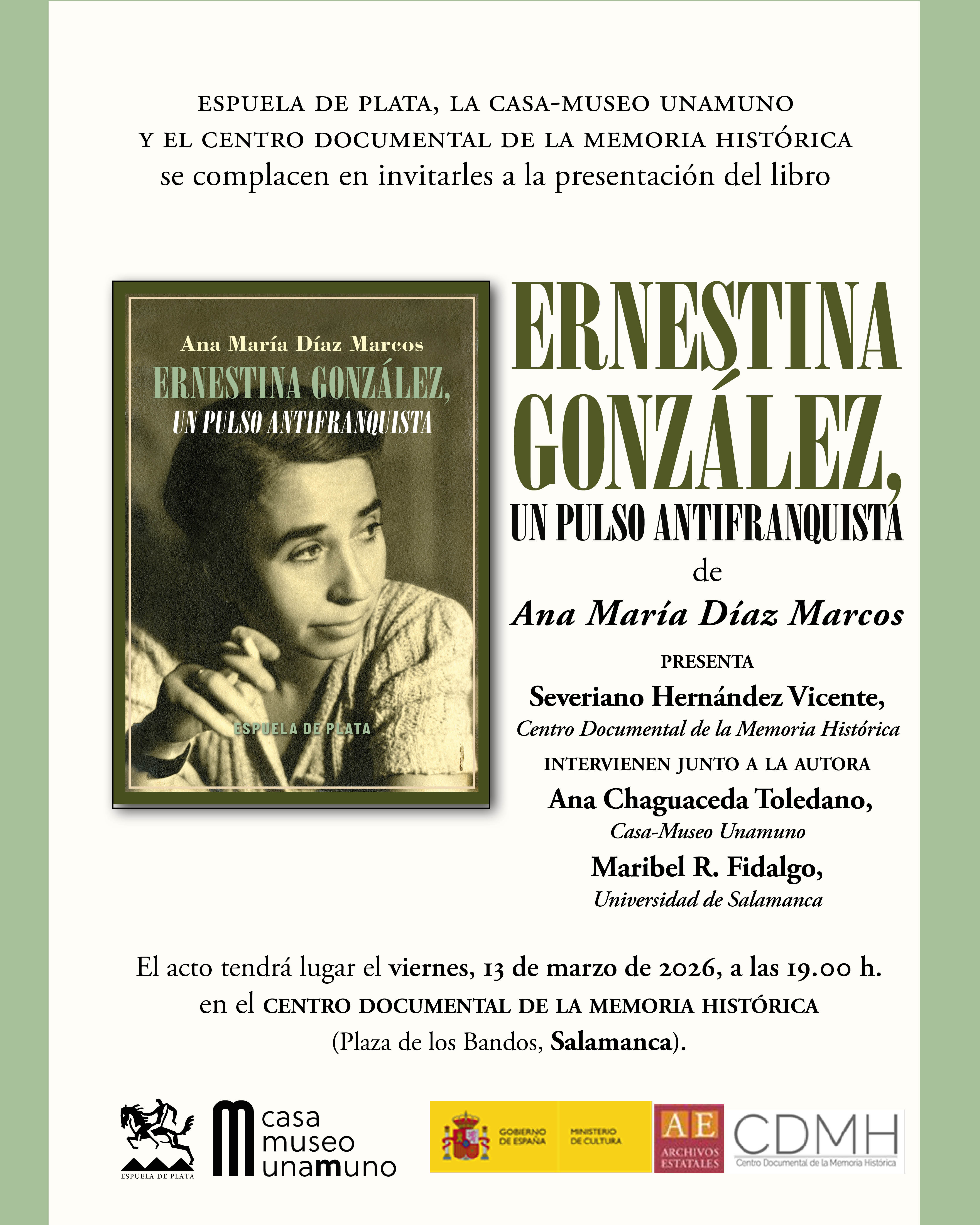 Espuela de Plata, la Casa-Museo Unamuno y el Centro Documental de la Memoria Histórica organizan la presentación del libro Ernestina González, un pulso antifranquista, de Ana María Díaz Marcos.