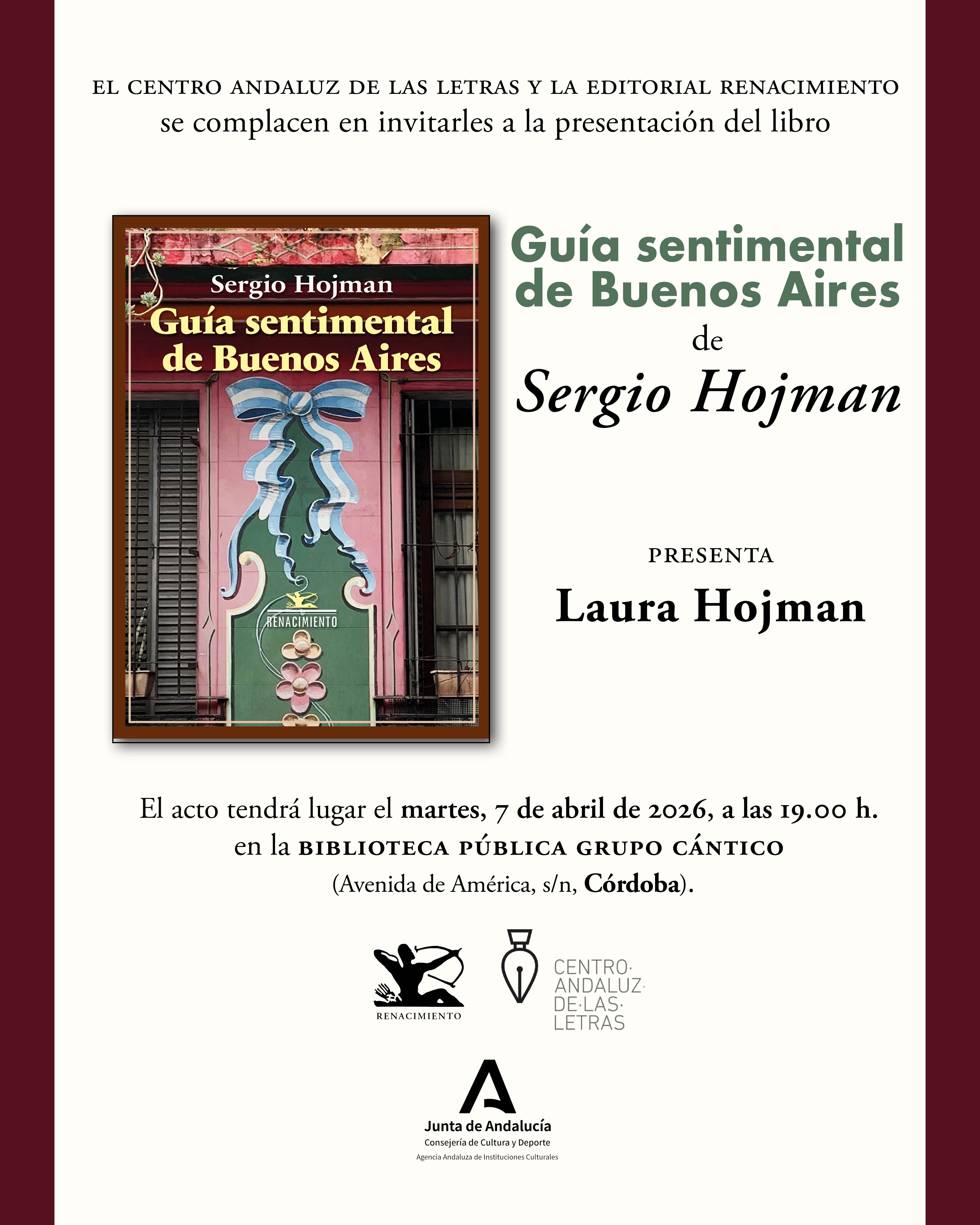 El Centro Andaluz de las Letras y la Editorial Renacimiento se complacen en invitarles a la presentación del libro Guía sentimental de Buenos Aires, de Sergio Hojman.