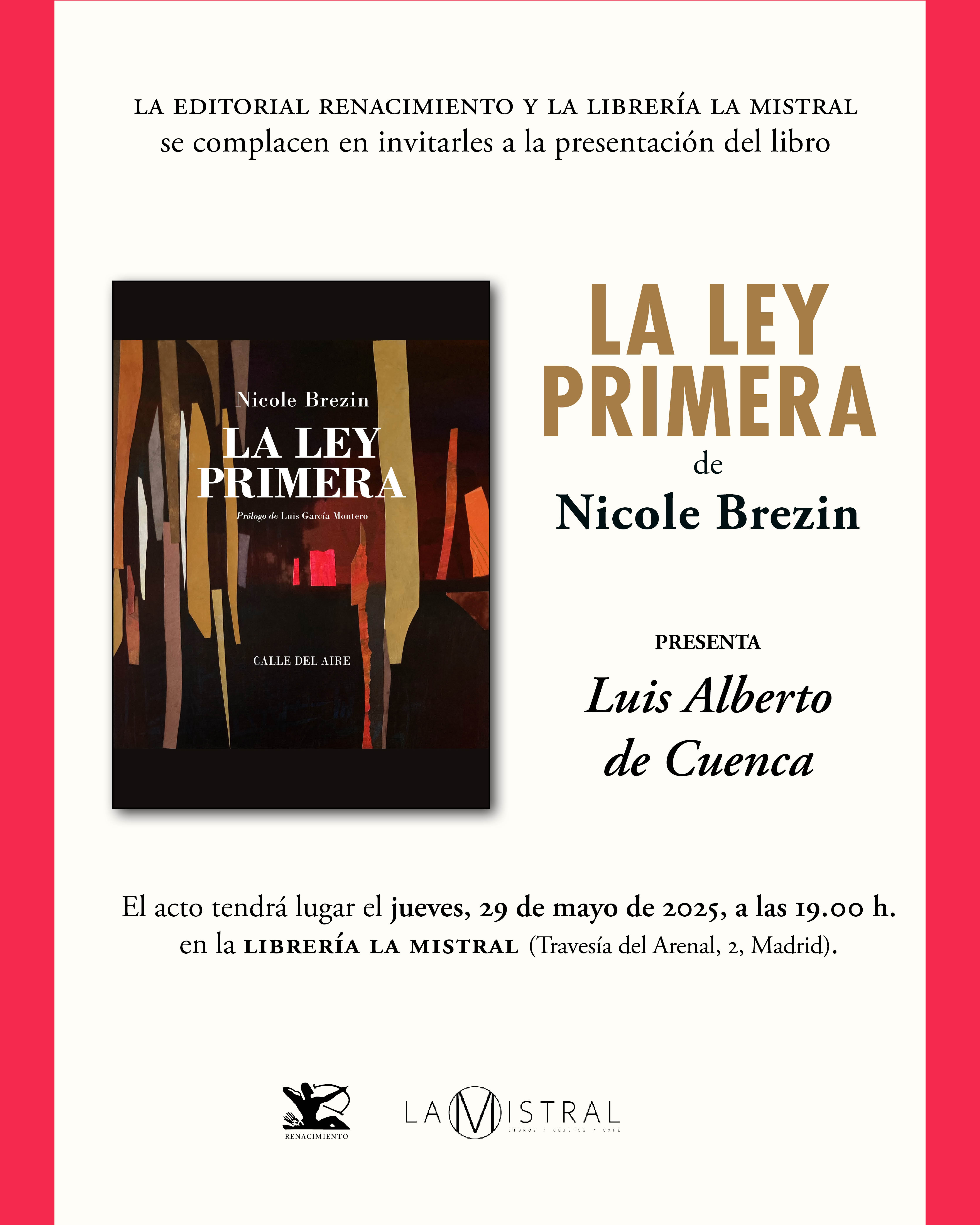 El próximo jueves 29 de mayo de 2025, a las 19:00 h, la librería La Mistral (Travesía del Arenal, 2, Madrid) acogerá la presentación del libro La ley primera, de Nicole Brezin, publicado en la colección Calle del Aire de la editorial Renacimiento.