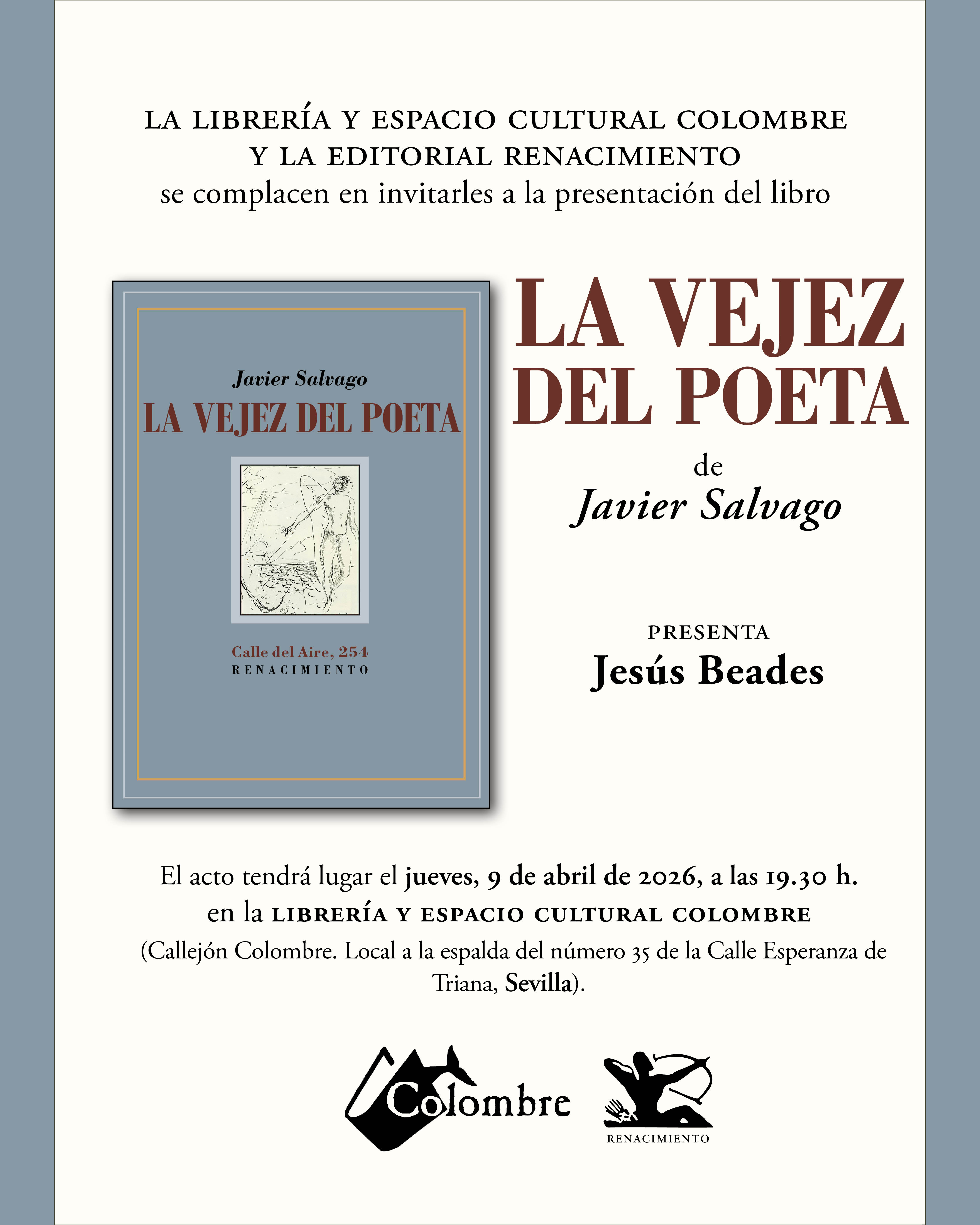 La Librería y Espacio Cultural Colombre y la Editorial Renacimiento os invitan a la presentación del libro La vejez del poeta, de Javier Salvago.