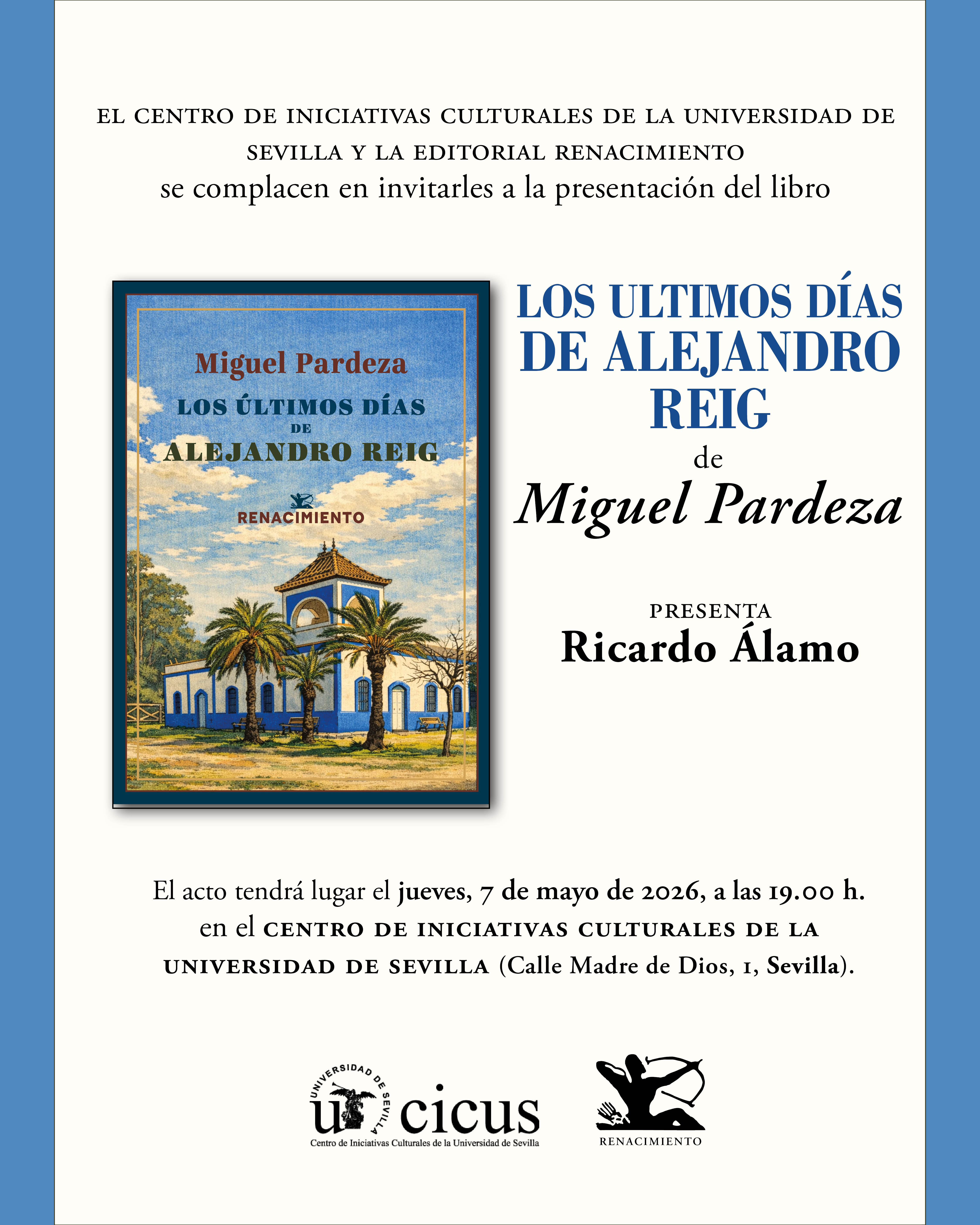 El próximo 7 de mayo a las 19:00 h se celebrará en el Centro de Iniciativas Culturales de la Universidad de Sevilla (CICUS) la presentación de Los últimos días de Alejandro Reig de Miguel Pardeza: una excelente novela, lúcida y perturbadora, sobre la escritura, el deseo y la fragilidad de las relaciones humanas.