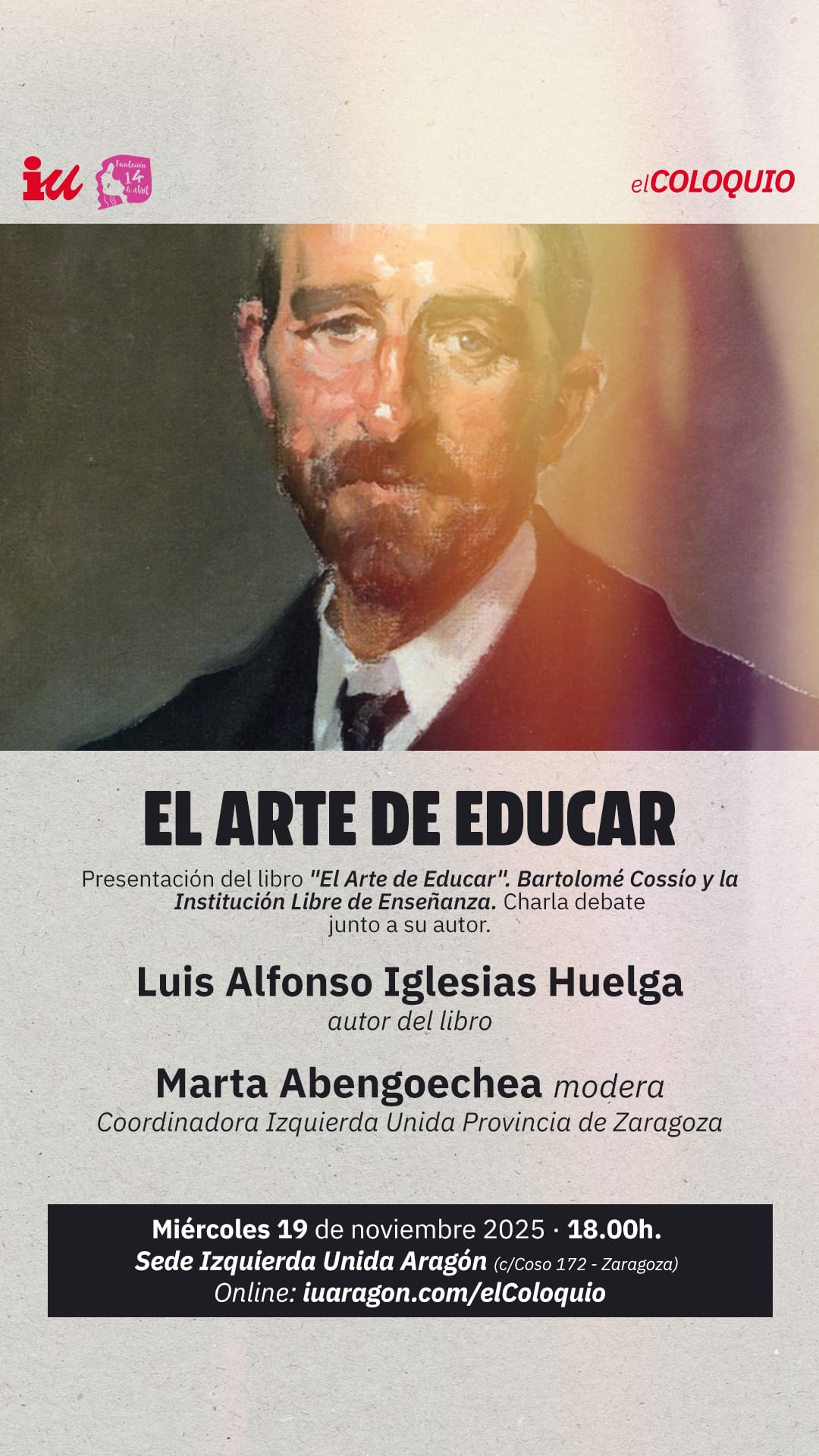 Os invitamos a la presentación del libro El arte de educar. Bartolomé Cossío y la Institución Libre de Enseñanza, de Luis Alfonso Iglesias Huelga, el miércoles 19 de noviembre de 2025 a las 18:00 h en la Sede de Izquierda Unida Aragón (Coso 172, Zaragoza).