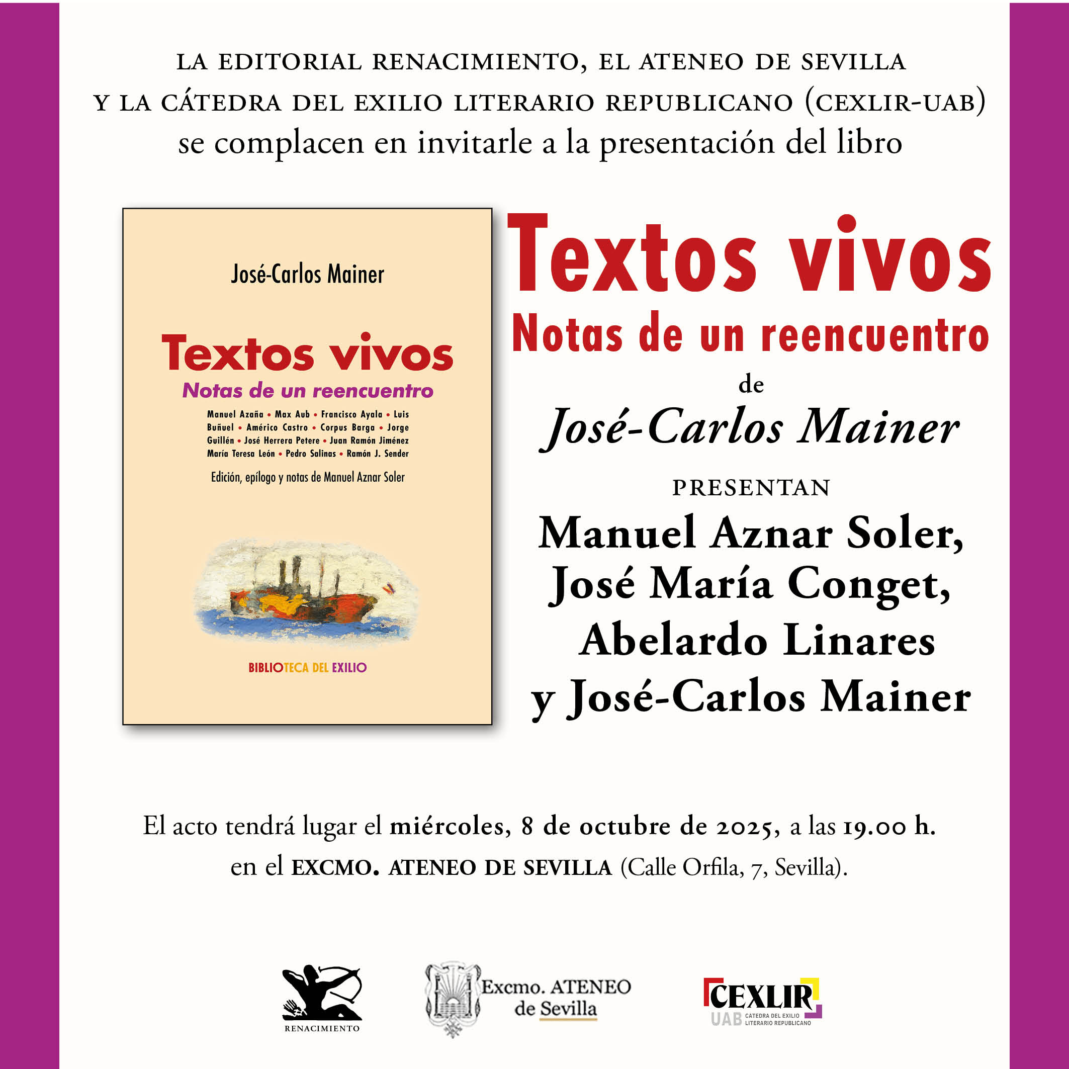 Os invitamos a la presentación del libro Textos vivos. Notas de un reencuentro de José-Carlos Mainer, que tendrá lugar el miércoles, 8 de octubre de 2025, a las 19:00 h, en el Excmo. Ateneo de Sevilla (Calle Orfila, 7, Sevilla). Participarán Manuel Aznar Soler, José María Conget, Abelardo Linares y el propio José-Carlos Mainer.