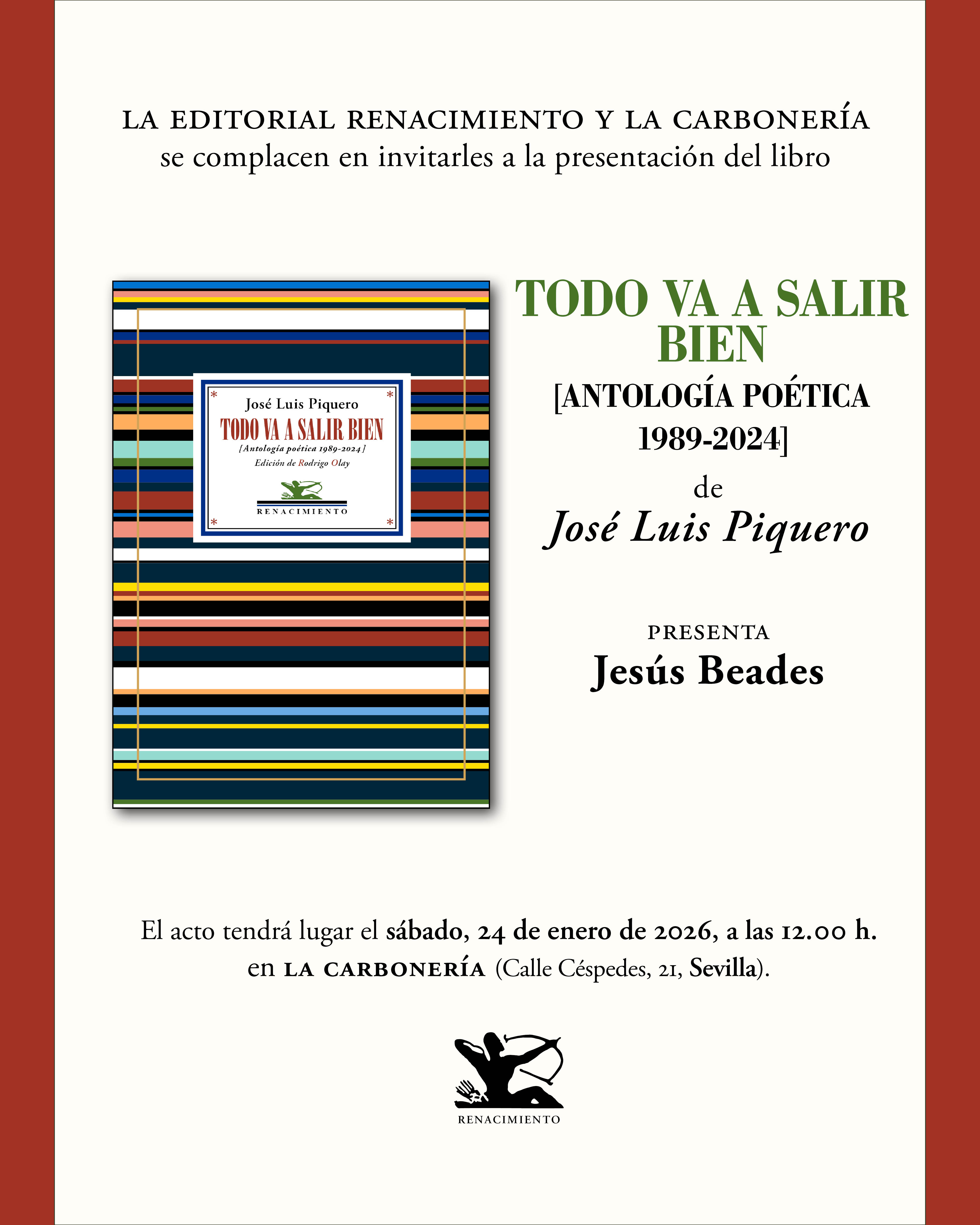 La Editorial Renacimiento y La Carbonería invitan a la presentación del libro Todo va a salir bien (Antología poética 1989-2024), de José Luis Piquero, que tendrá lugar el sábado, 24 de enero de 2026, a las 12.00 h, en La Carbonería (calle Céspedes, 21, Sevilla).
