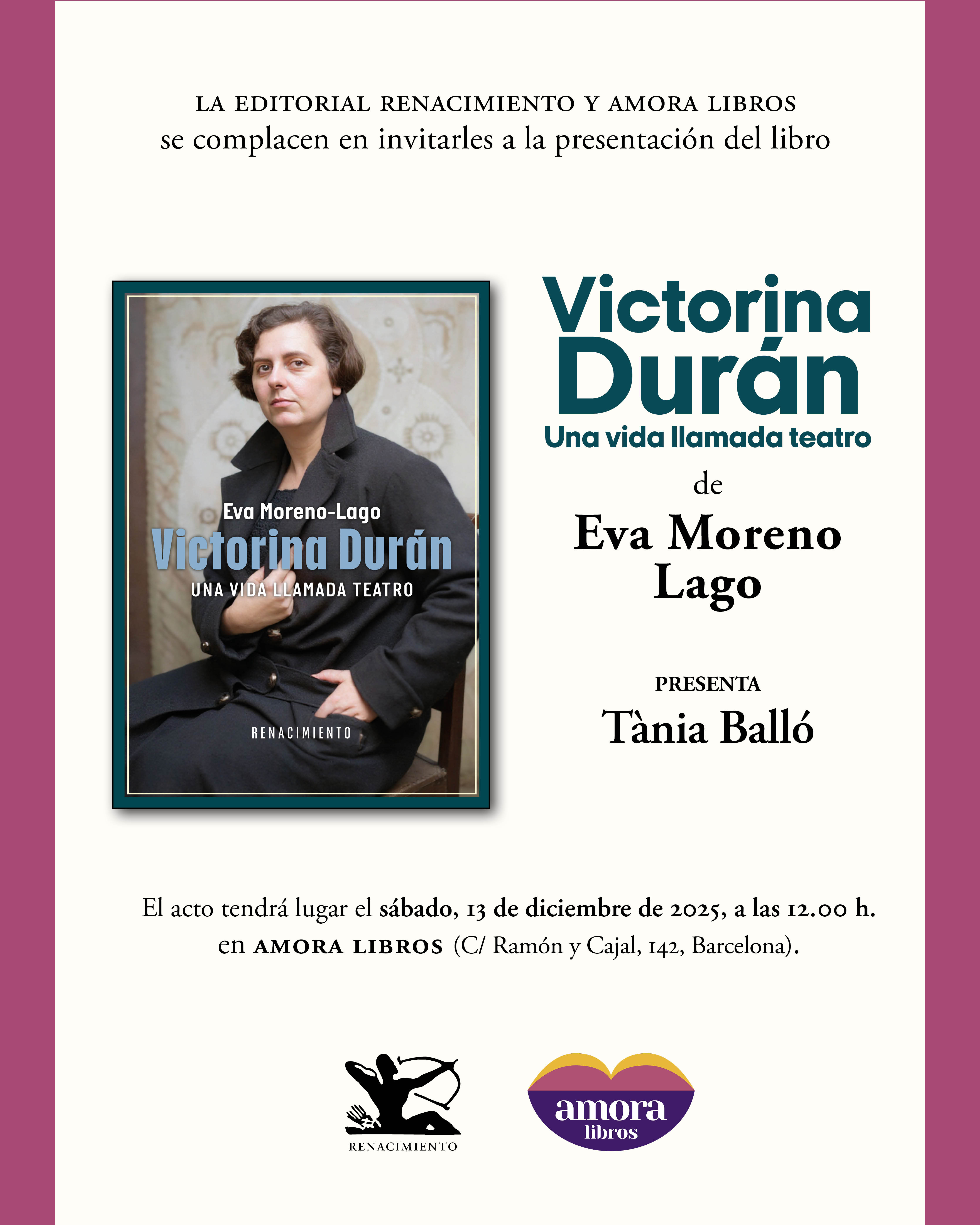 Os invitamos a la presentación del libro Victorina Durán. Una vida llamada teatro, de Eva Moreno-Lago, la primera biografía de Victorina Durán, icono lésbico de la España del siglo XX y pionera del vestuario teatral moderno. El acto tendrá lugar el sábado 13 de diciembre de 2025, a las 12:00 h, en Amora Libros (C/ Ramón y Cajal, 142, Barcelona), y será presentado por Tània Balló.