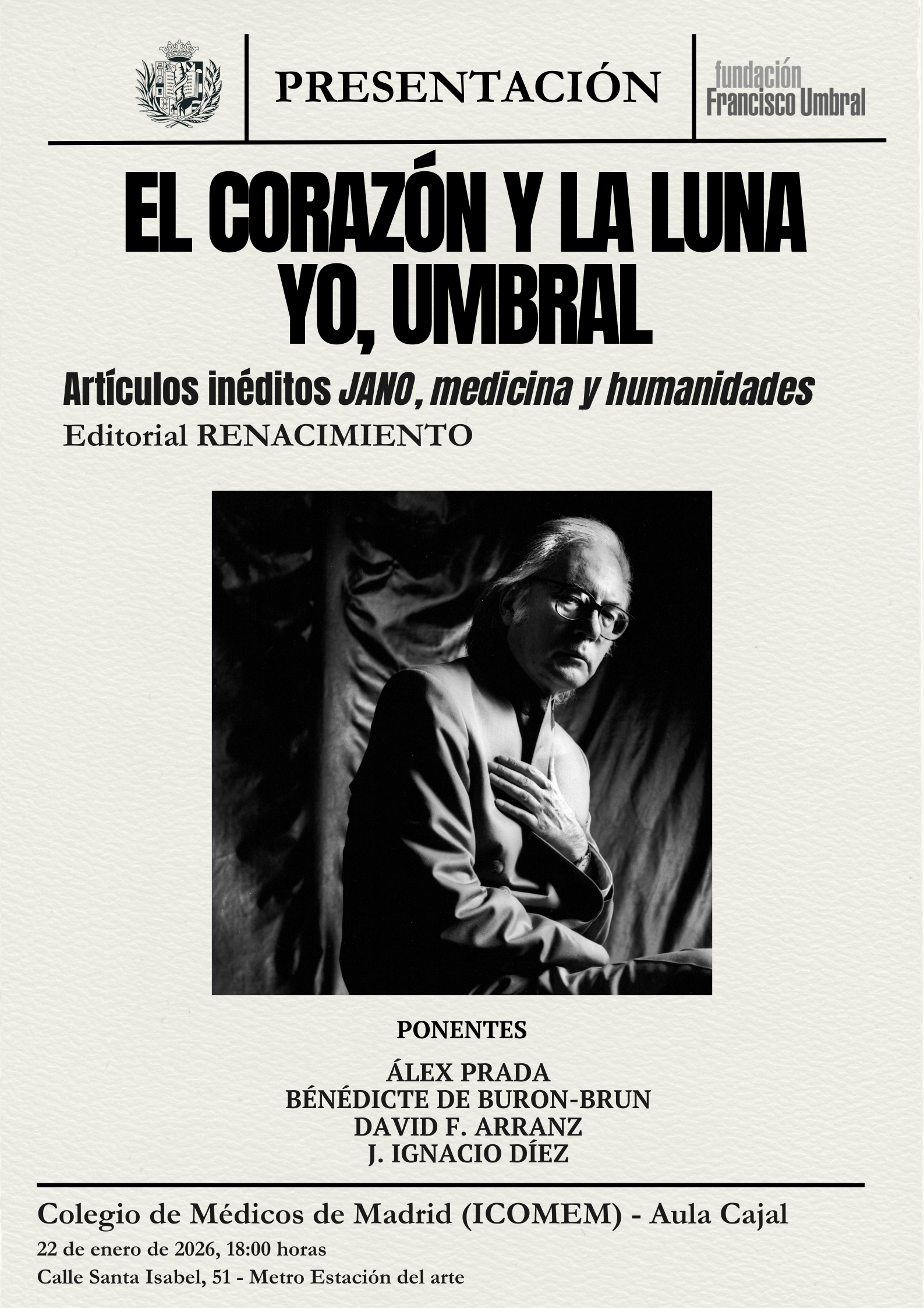 Os invitamos a la presentación de los libros Yo, Umbral y El corazón y la luna, dos volúmenes que recogen los artículos médicos y humanísticos publicados por Francisco Umbral a lo largo de más de tres décadas en la revista Jano, medicina y humanidades. El acto tendrá lugar el 22 de enero de 2026, a las 18:00 h, en el Colegio de Médicos de Madrid.