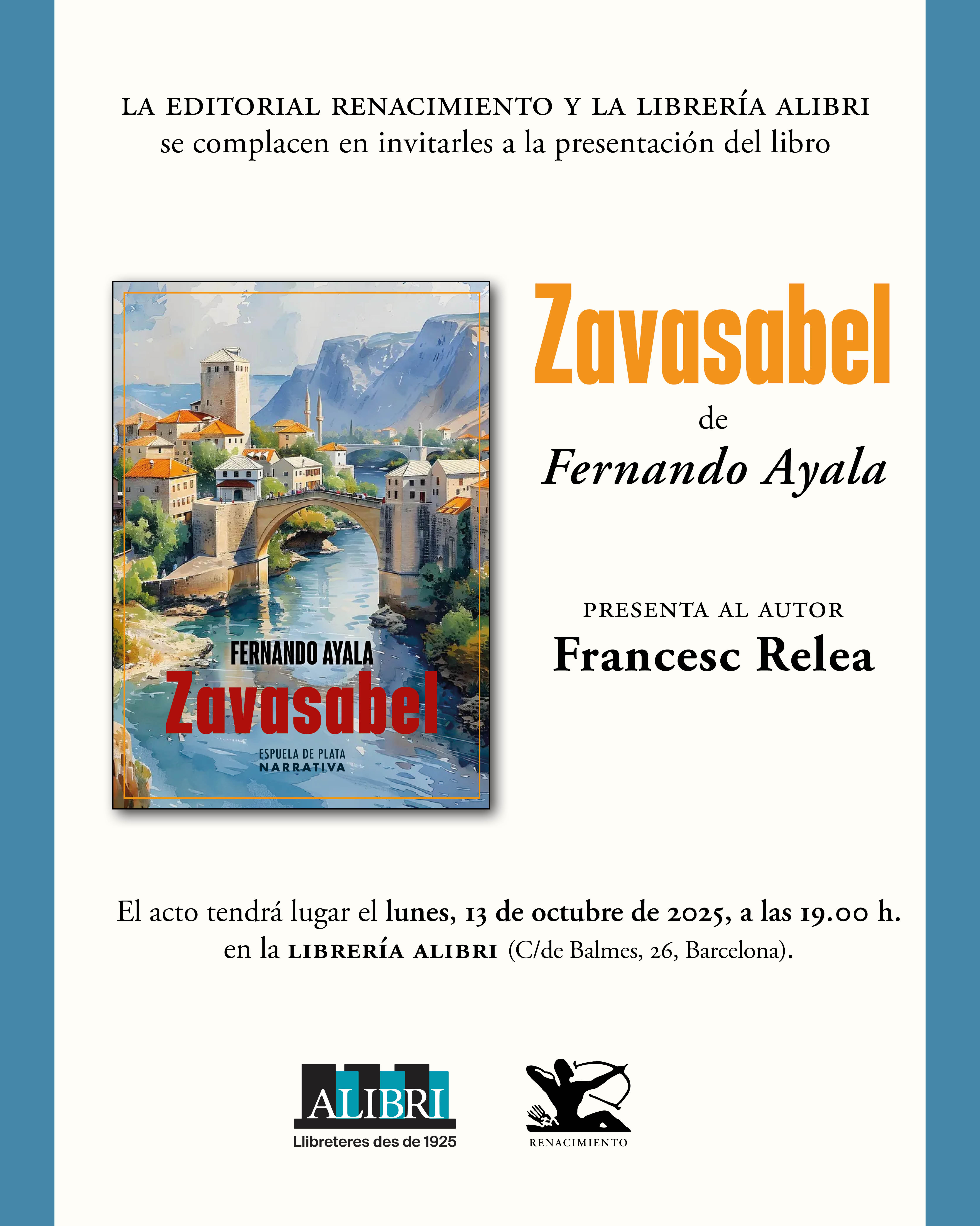 Os invitamos a la presentación de la novela "Zavasabel" de Fernando Ayala, que tendrá lugar el lunes, 13 de octubre de 2025, a las 19.00 h, en la librería Alibri (C/ de Balmes, 26, Barcelona). El autor estará acompañado por Francesc Relea.
