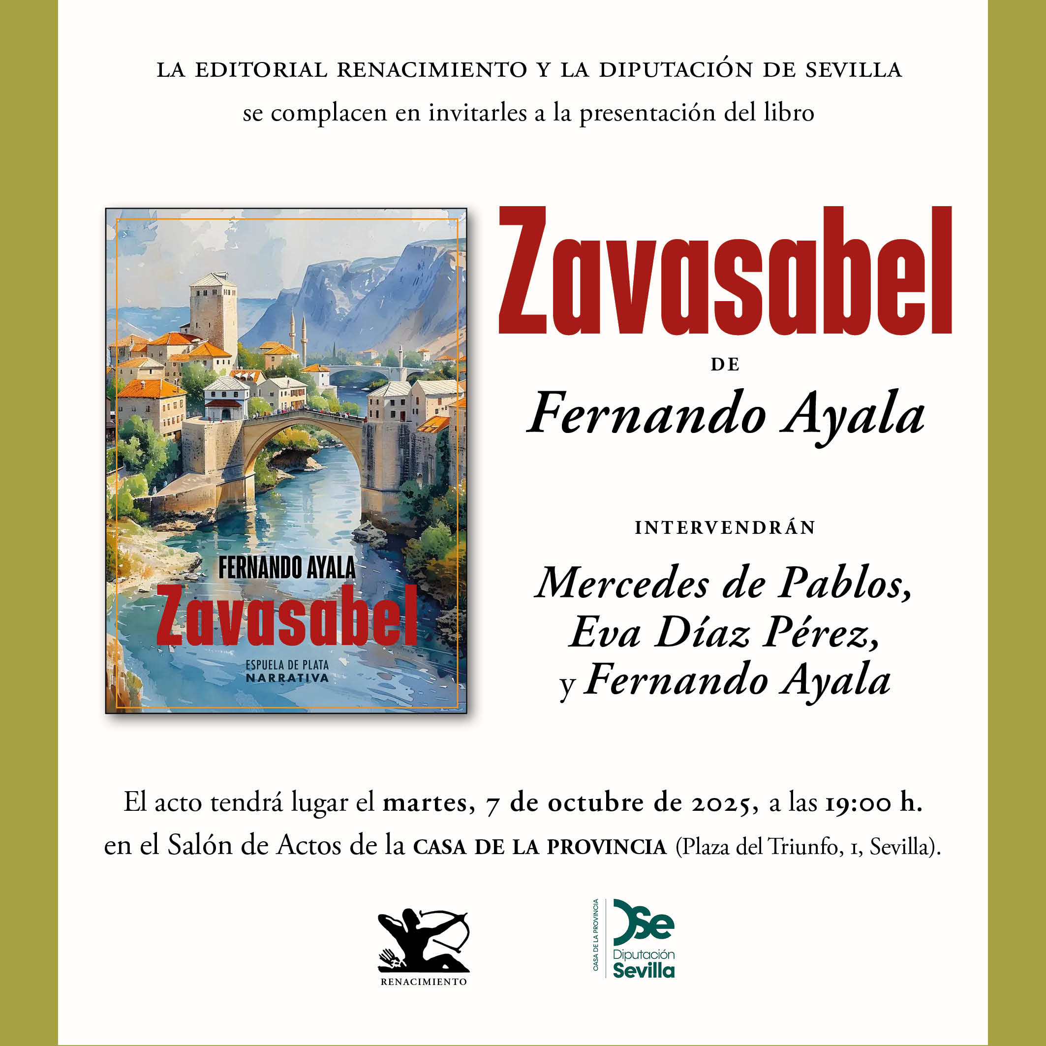Os invitamos a la presentación de la novela Zavasabel de Fernando Ayala, el martes, 7 de octubre de 2025, a las 19:00 h, en la Casa de la Provincia (Plaza del Triunfo, 1, Sevilla). Participarán Mercedes de Pablos, Eva Díaz Pérez y Fernando Ayala.