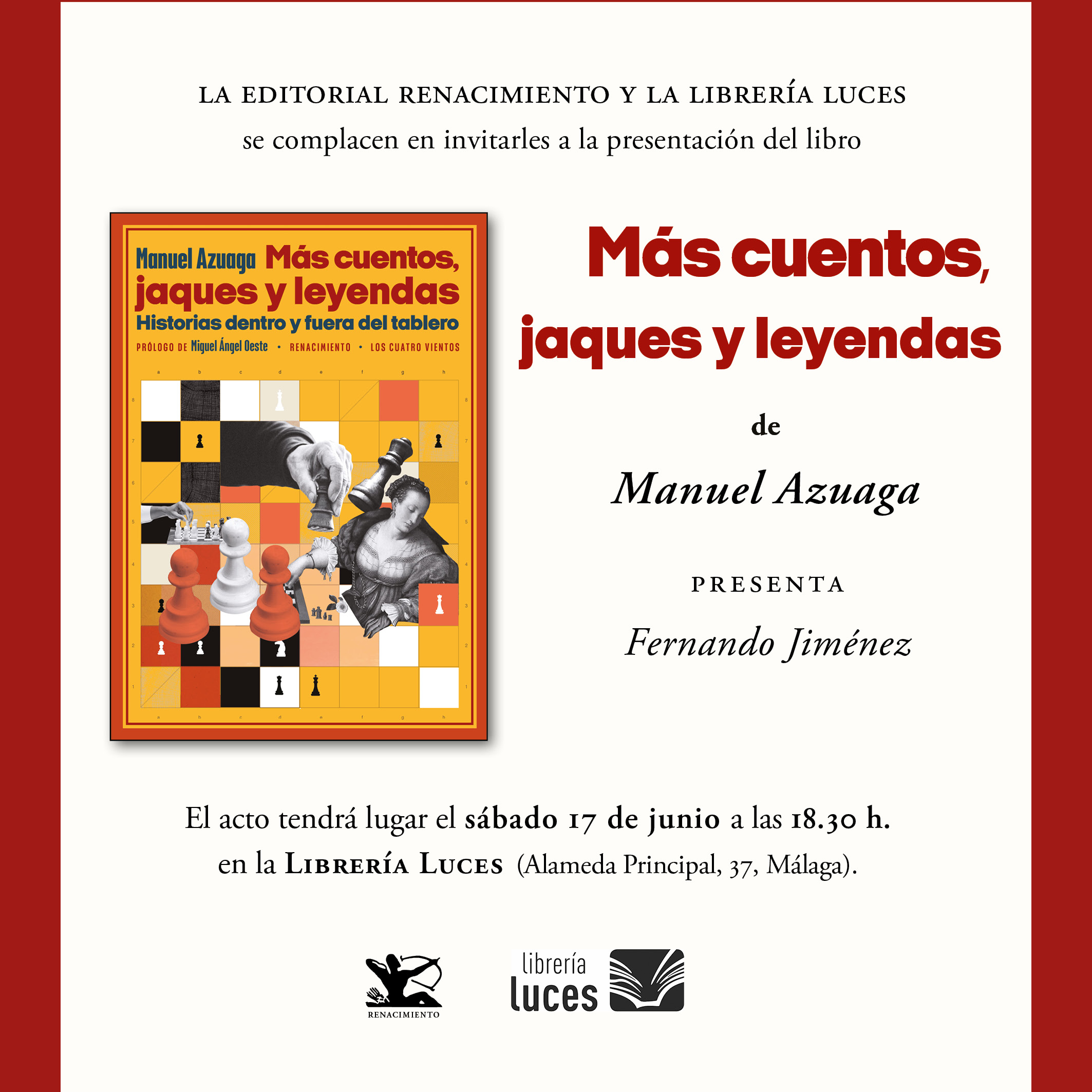 Os invitamos a la presentación en Málaga de 'Más cuentos, jaques y leyendas' de Manuel Azuaga, un libro lleno de relatos y personajes en blanco y negro, narraciones fantásticas en las que el ajedrez se revela ante el lector como algo más que un juego.